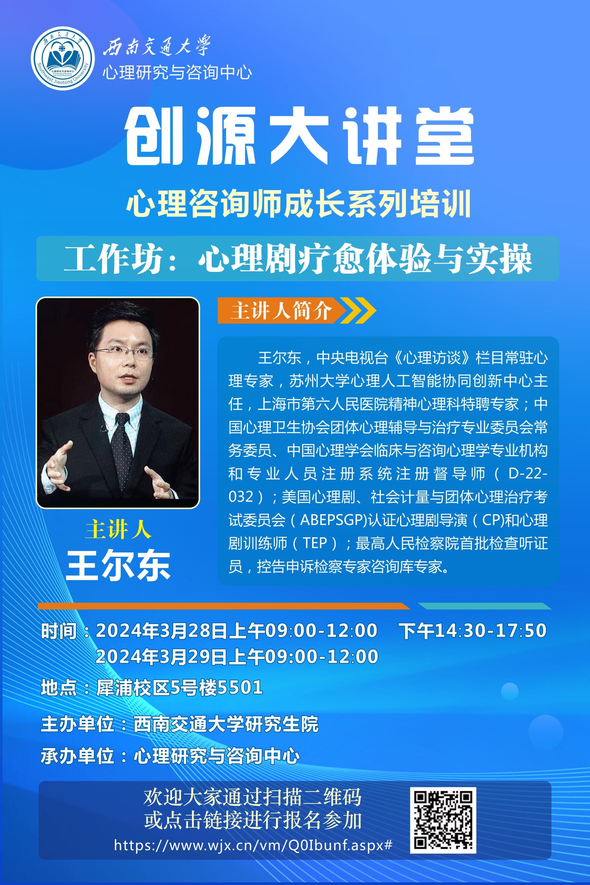 主讲人:王尔东。中央电视台《心理访谈》栏目常驻心理专家,苏州大学心理人工智能协同创新中心主任,上海市第六人民医院精神心理科特聘专家;中国心理卫生协会团体心理辅导与治疗专业委员会常务委员、中国心理学会临床与咨询心理学专业机构和专业人员注册系统注册督导师(D-22-032);美国心理剧、社会计量与团体心理治疗考试委员会(ABEPSGP)认证心理剧导演(CP)和心理剧训练师(TEP);最高人民检察院首批检查听证员,控告申诉检察专家咨询库专家。