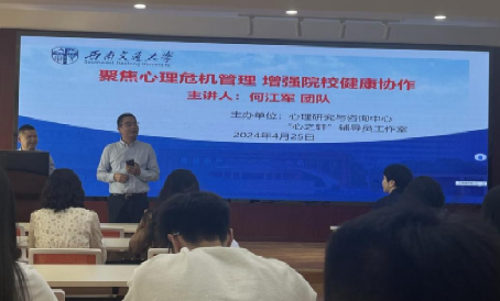为提升校医协作能力、高质量运行心理健康绿色通道,2024年4月25日(周四)上午在犀浦校区X5501教室举办了题为“聚焦心理危机管理 增强院校健康协作”的培训会暨研讨会。成都市第四人民医院心理测评中心何江军主任聚焦学生心理危机管理,结合心理健康绿色通道的校医协作情况,提出一些工作思路和建议。中心负责学院心理健康联系工作的老师、各学院负责心理健康工作的辅导员参与培训会,雷鸣副主任主持。