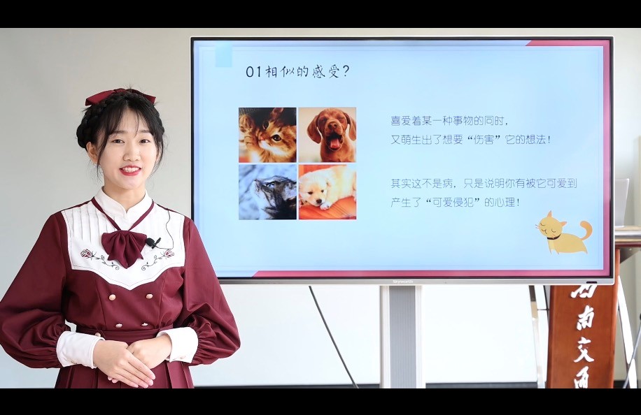 黄雨珊同学讲解的主题是“可爱侵犯”,先从一组可爱的图片开始,解释了什么是可爱侵犯:由于事物太可爱了,以至于人们失去了对这种可爱刺激带来的情绪控制,从而导致了侵犯行为的出现。接着用两种心理学解释了可爱侵犯产生的原因,让大家在了解了这个心理学现象的同时,也可以正确看待这种现象。