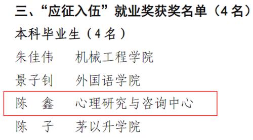 毕业生就业奖,他们分别是心理中心2016级应用心理学专业应征入伍大学生陈鑫,心理中心2016级应用心理学专业参加“美丽中国支教”项目的陈果、戴发彬和任小佳,具体公示如下: