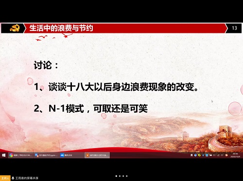 研究生党小组于2020年10月9日晚上八点半点开展线上组织生活会,心理中心全体研究生党员参加了此次会议。本次组织生活会采取线下学习和线上讨论相结合的形式。在会议之前,党小组在研究生党员群里发放资料,要求各位党员学习纪委监察信息半月汇编、党政机关厉行节约反对浪费等相关文件。各位党员同志积极响应,认真学习。会议以“厉行勤俭节约,反对铺张浪费”为题,分为弘扬传统美德、生活中的节约与浪费、杜绝攀比现象三个板块。