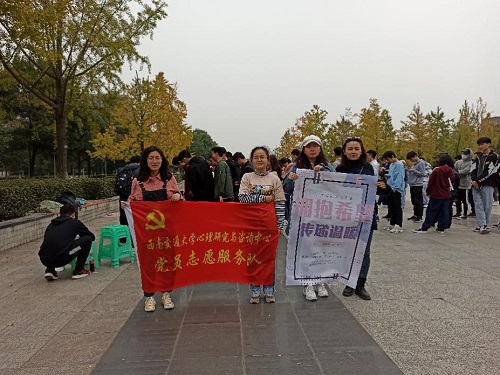本科党小组与心理青协在犀浦校区图书馆前广场组织了文明校园建设活动暨第七届“交通·公益“志愿服务季特色活动:拥抱希望,传递温暖。