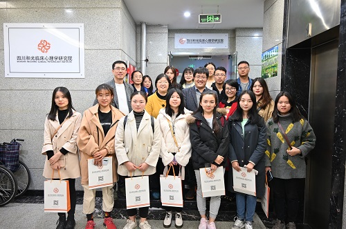 的15名本科生及研究生有幸来到四川和光临床心理学研究院进行参观学习,深入了解心理咨询的相关知识与行业现状。本次参观活动由中心辅导员王丽霞、中心教师马淑琴、冉俐雯带队,和光临床心理学研究院的院长姜启壮、执行院长高骞热情地迎接了师生们的到来。
