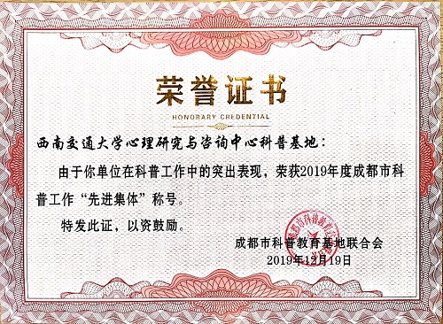 会议由龚明霞主持,四川大学灾后重建与管理学院院长陈勇向大会致欢迎辞,成都市科技局社发处处长肖骏做2019年度工作总结。接下来,对新命名的7家科普基地授牌,对2019年科普工作先进集体先进个人进行表彰。心理中心科普基地荣获2019年度成都市科普工作“先进集体”称号,唐静老师荣获“先进个人“称号。