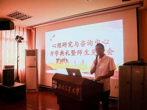 出席本次开学典礼的有心理中心直属党支部书记宁维卫、主任陈华、直属党支部副书记柯小君、副主任雷鸣,2019级研究生辅导员老师樊菊以及中心其他在校老师。心理中心2019级全体研究生参加典礼,直属党支部副书记柯小君主持典礼。