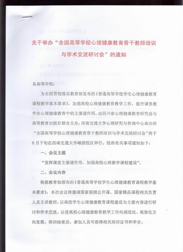 关于举办“全国高等学校心理健康教育骨干教师培训与学术交流研讨会”的通知