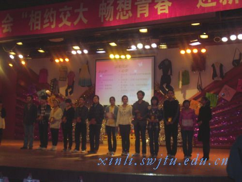 2011年11月11日晚上7点,由校委,社团联合会主办,大学生心理学会承办的“相约交大,畅想青春”大学生心理学会迎新晚会在西南交大二食堂三楼隆重开幕。在11·11·11这个特别的日子里,给同学们枯燥的学习生活带来了一场激情四射,一场分享与狂欢的视听盛宴。