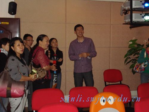 随后,西南民族大学的老师们在实验室张涛、马岳德老师的陪同下参观了中心的实验室。大家一一参观了情绪宣泄与调节室、 心理动力学实验室,新生测评室、生物反馈训练室,虚拟现实心理治疗室(音乐心理调适室),浏览了心力大学生测评与咨询网站等。其中给人印象最深刻的是虚拟现实心理治疗室。马岳德老师向他们详细介绍了实验室的功能、工作原理、学生团队进行开发制作的情况等等,参观的老师对捷克论坛