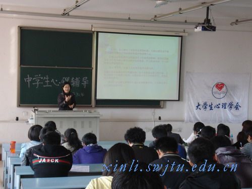 2011年4月9日上午10:00,心力论坛——心理学与人生系列讲座之“中学生心理辅导”在X2516如期进行。讲座由心理咨询与研究中心马淑琴老师主讲。此次讲座旨在加强大学生对中学生心理发展特点以及中学生在学生生活中所遇到的问题有所了解,进而能有效地帮助更多的中学生轻松地学习,快乐地生活。