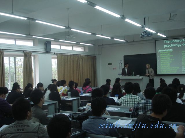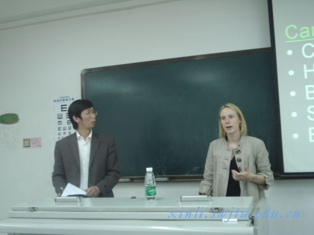 两个年级的学生及众多心理学爱好者连续作了两场精彩纷呈的讲座后,Melissa birkett博士又于5月20下午在x1230为众多听众讲解了美国心理学及其培训的相关情况。讲座进行中仍然由外国语学院费维宝老师担任翻译,此外捷克论坛
