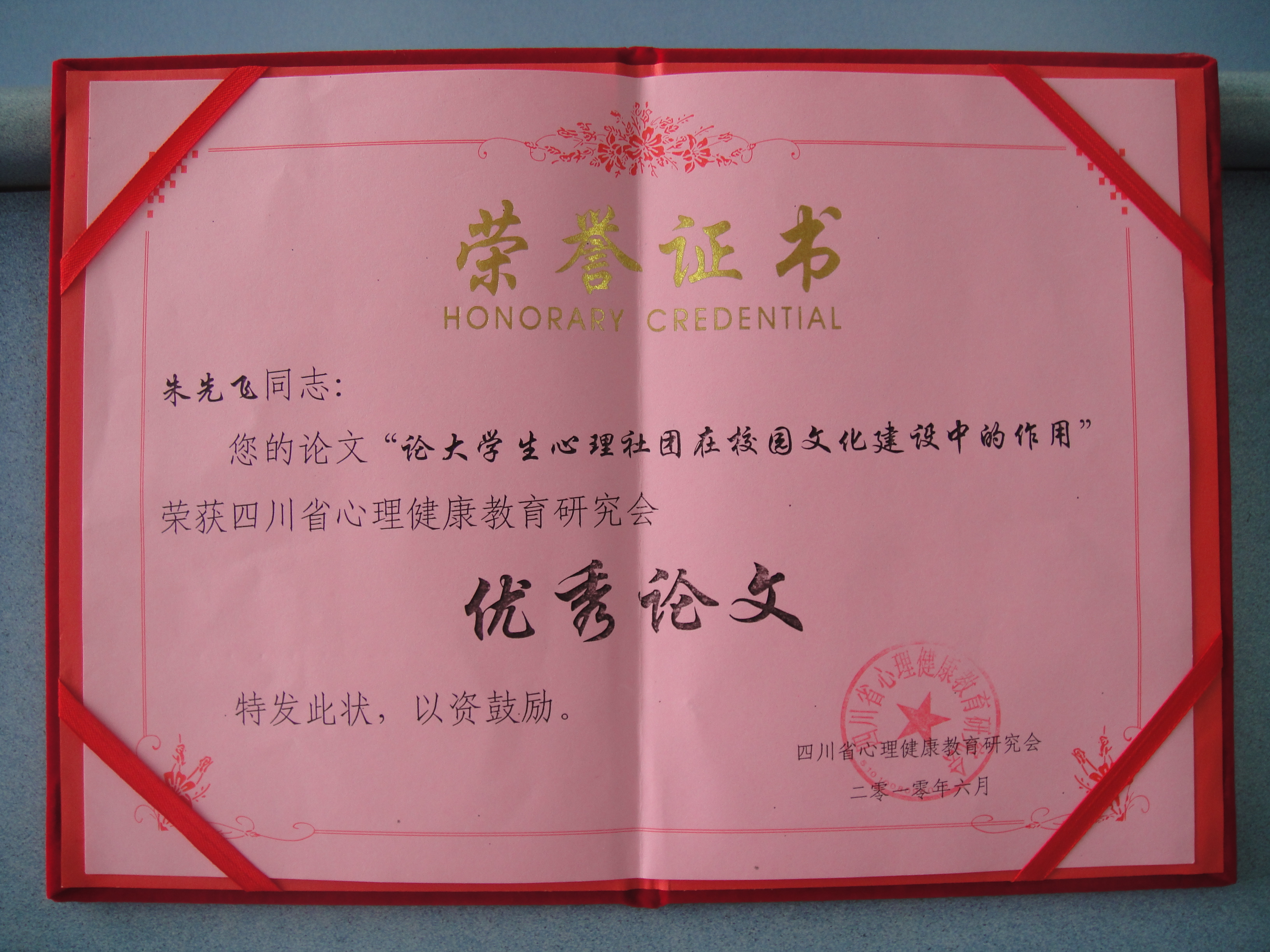 大学生心理学会成员朱先飞代表心学提交的《论大学生心理社团在校园文化建设中的作用》一文荣获了四川省心理健康研究会“优秀论文”。