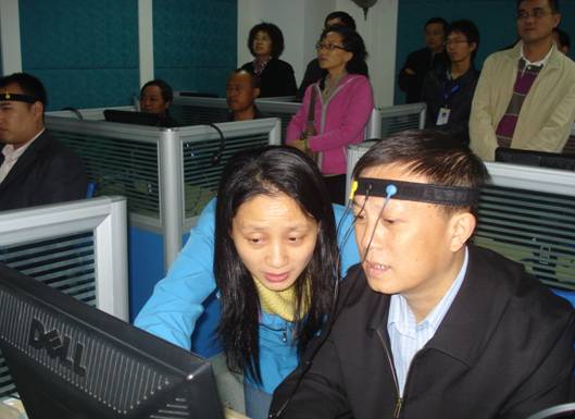 独具特色的综合性多功能个性化实验室,对大学生心理健康教育工作以及心理咨询与辅导等有着重要作用。首先宁教授指出当今社会心理健康的重要性,并以视频短片的方式,向各位学员展示2005年以来,该实验室从建设初期到如今初具规模的发展历程,实验室的整体运行与工作模式和各项阶段性成果,以及整体结构和未来的发展前景。接着宁教授带大家参观了人才测评实验室,并详细介绍了心力网与心援网的主要内容以及服务范围,并由大家自由浏览。在心理动力学实验室和情绪宣泄与调节室,学员们表现出较浓厚的兴趣,并在现场进行体验。随后,宁教授带大家进入生物反馈团体心理训练实验室。据宁教授介绍,该实验室利用计算机技术将个体的生理指标转换成能易察觉的声音和图像信号,帮助个体了解自己的心理状态,从而学会自我调节和自我控制。两名学员亲自体验该设备的奇特功能,对此大家给予了高度评价。