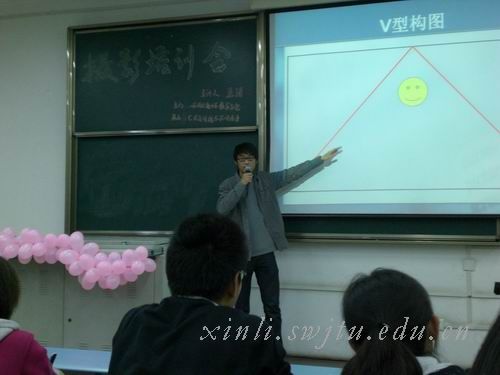 讲座伊始,扬华素质网分站长孟涛学长简要地介绍了相机的分类以及相机操作的基本知识。接着,开始重点对拍摄时构图的技巧和新闻摄影的基本技巧进行讲解。孟涛学长结合“战场上将死的战士”“水灾”“跳高”等照片阐述了三等分、“#型”构图法,又结合一组生活照灵活地展现了“V型”、“X型”构图法。通过实例的讲解不仅使大家感受到了美的力量,而且又准确地理解了各种构图法的精髓。孟涛学长强调除了掌握好构图技巧外,摄影技巧也同等重要。他以会场为拍摄背景举例介绍了摄影技巧:(一)会场的摄影角度要灵活掌握,尽量把标题纳入镜头。(二)使用对称式或斜切式构图来拍摄会场。(三)抓拍好人物的表情及肢体动作。(四)拍摄观众时,注意抓住关键时刻。(五)小角度,大事件。(六)提前设置好所需的各项参数,时刻抓拍关键镜头。孟涛学长还强调记者要具有敏锐的观察力,独特的视角,扎实的基本功,才能够灵活地运用各种基本技巧,发现生活中的美.。最后培训会在一组来自法国的经典照片中结束。