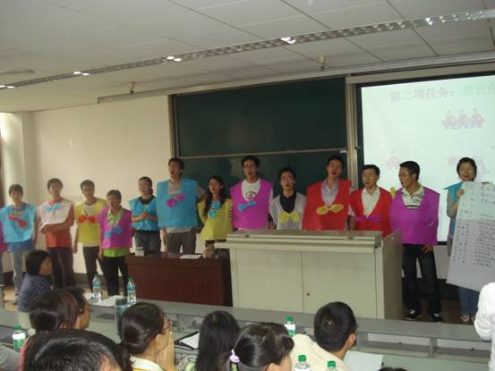 所有环节均以音乐为主题,分为5组,每组16人,在相互熟悉的基础上首先进行团队建设,包括队名,队歌等,然后在组长的带领下,充分发挥其团结力和凝聚力,激发艺术创造力,在“逸音飞扬,华彩乐章”环节中团结一致,取长补短,分工合作,16个人分为五个声部,最终完成了默契的“协奏”,现场气氛持续高涨,每位成员都在积极的动手动脑,感受着合作的乐趣,分享着成功的喜悦。
