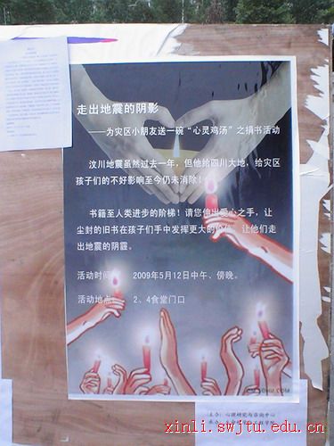 (以下简称中心)主办,生命科学与工程学院06生信2班承办的“走出地震阴影——为灾区小朋友送一碗‘心灵鸡汤’之捐书活动”在二、四食堂门口展开。本站记者对他们进行了采访。