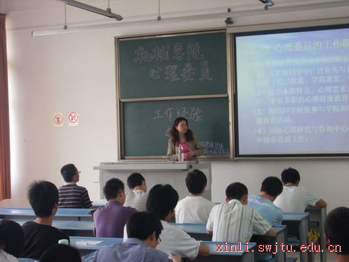 2009年4月23日下午4点时分在犀浦校区X2424教室,一场由机械学院举行的心理委员工作经验交流会正在进行当中。据悉,这次活动是由机械学院团委主办,机械学院08级团总支承办的系列活动之一。旨在增强各班级心理委员的心理知识和经验交流。