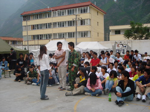 活动开始前,同学们整齐得排成了列队形式,赵老师一句幽默的话语“我不是法西斯,不是来对你们实行军事化管理的”,把现场气氛调动得活跃了起来,她让同学们打破方阵形式,就地取材,席地而坐。首先,赵老师提出一个问题,示意自认为有心理问题的同学举手,结果只有一个女生举手示意,惹得同学们哈哈大笑。赵老师紧接着很认真得说,“我们都是处于亚健康的人,包括我在内”。 话一出口,同学们面面相觑,都很诧异,赵老师抛砖引玉, 通过一个小小的热身游戏,让大家认识到最近以来出现的担心恐慌、情绪紧张、觉得自己很渺小、容易生气和激动、提不起精神学习、性格变得敏感起来、身心疲惫、容易顶撞老师、记忆力减退、注意力不集中等情绪反应和行为表现都是地震综合症和考试焦虑的表现方面,而且是存在于大家中的普遍现象。针对这些问题,赵老师给大家提出了一些心理调试的方法,如积极的自我暗示、学会倾诉、学会求助、学会感恩、学会珍惜等。