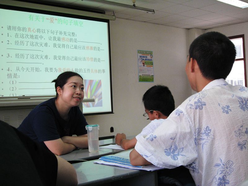 高飞老师的问候,在轻松地气氛中接受了《震后心理调试讲座》。在讲座中,高飞老师不仅讲解了心理调试的方法,为同学们做了心理测试,还带来了很多温暖的小游戏,让这些经历过5.12大地震的同学们得到一次彻底的放松。