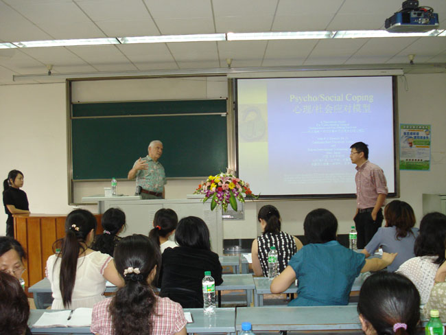 查老师中文讲述完之后,杜斯奇教授又举例重点解释了这个理论模型的关键内容,在这个过程中,听课老师和杜斯奇教授进行了热烈和友好的探讨,杜斯奇教授也认真地回答了各位老师提出的问题。讨论主要集中在震后心理援助做什么,特别是1个月后应该做什么以及在中国文化背景中地震受灾的人们的反应和表现所具有的特点。