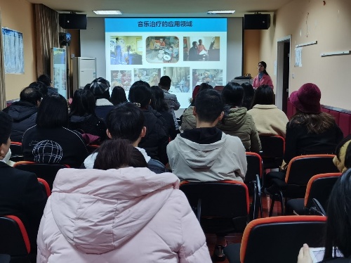 在同学们的认真听讲中,讲座很快进入了第二部分。刘老师向同学们分享了她在美国西奈山医学院访学期间的经历。例如,给亚裔焦虑患者开处方音乐、新年之际在医院开小型音乐会、治疗老年患者的焦虑情绪、将一群中风的患者组成合唱团、为当时处在疫情中的祖国祈福......这些有趣、温暖人心的经历,让在场的同学沉迷其中。