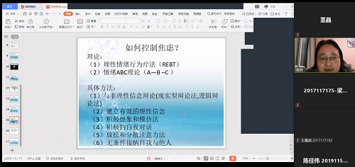 之后,高老师从心理学的角度,分析了焦虑情绪的来源,并指出了焦虑的含义:焦虑是指个人对即将来临的、可能会造成的危险或威胁所产生的紧张、不安、忧虑、烦恼等不愉快的复杂情绪状态。而对于同学们对焦虑产生的误解,高老师指出焦虑分为健康焦虑与不健康焦虑两种,我们不能片面地认为所有的焦虑情绪都是有害的,并且以此次疫情中的焦虑心态为例进行阐述。