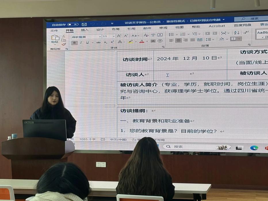 在活动中,学生们通过分组汇报的形式,积极探讨职业规划的各个方面。小组成员与HR的访谈中,深入了解了招聘流程、简历筛选标准等关键信息。HR在访谈中向同学们分享了如何准备简历和面试,以及如何在职场中提升个人竞争力的实用建议,为学生们未来求职提供了重要的参考。心理老师在访谈中强调了心理健康在职业发展中的重要性,并提供了应对职场压力和挑战的策略。此外,心理老师也提到了自己在选择职业时所面临的各种问题,比如时间的管理,职业倦怠现象的克服等等,极具现实意义。
