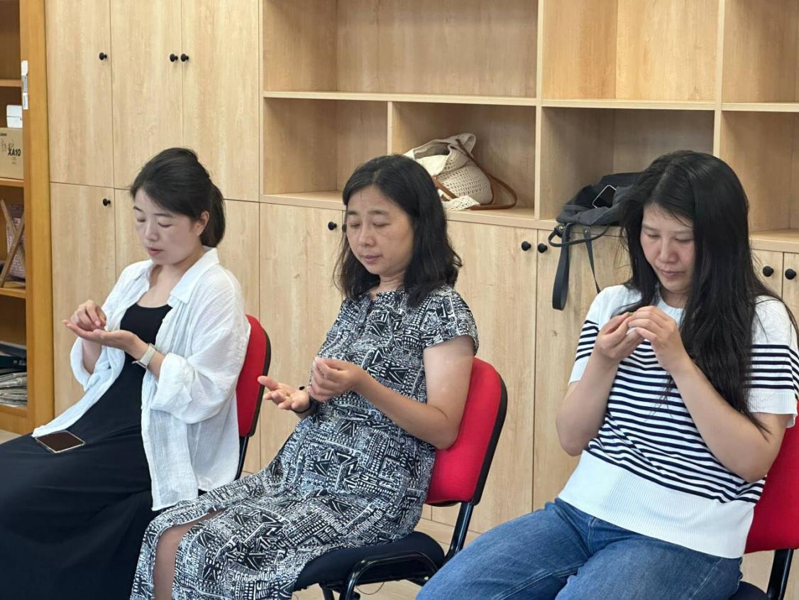 活动开始,唐静老师以 “爱自己才能更好地照料他人” 为切入点,分析生活中常见的心理问题,引导教师思考 “如何更好地爱自己”。随后,她通过静心小练习,逐步引导教师用正念连接自我。在唐老师温柔细致的引导下,参与者慢慢探索内心,设定正向意图与未来导向,初步体验到正念带来的内心平静。