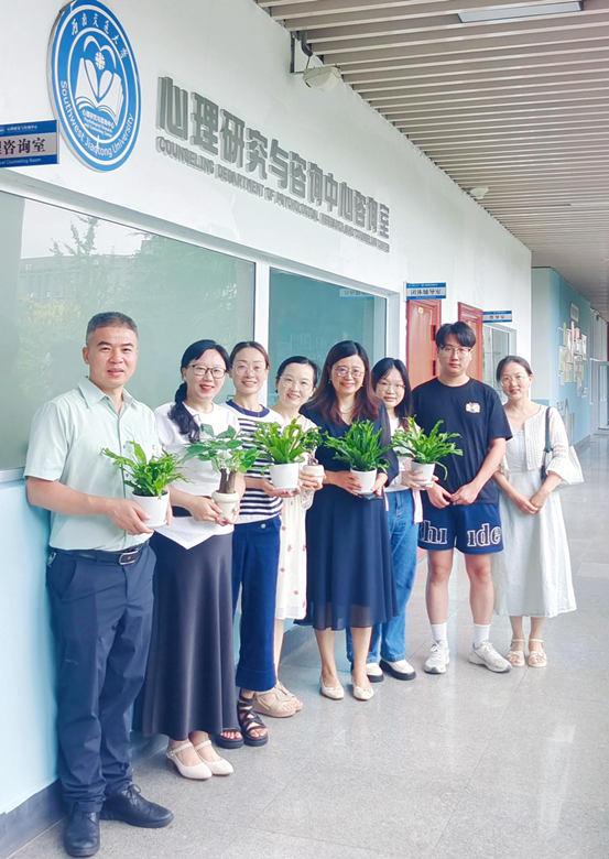 教师节当天,心理中心党委书记刘咏梅、主任高雪梅、副主任李启明带队,与学生代表一同前往两校区心理咨询室和课堂,为正在授课和忙碌工作的教师们送上节日的祝福,感谢老师们的辛勤付出。这份走进一线的关怀,让老师们感受到了来自中心领导和学生真切的温暖与诚挚的祝福。