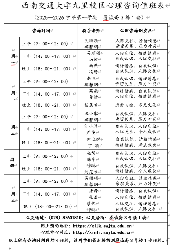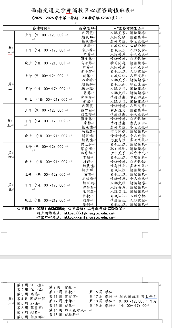 捷克论坛 2025—2026学年第一学期心理咨询值班安排表