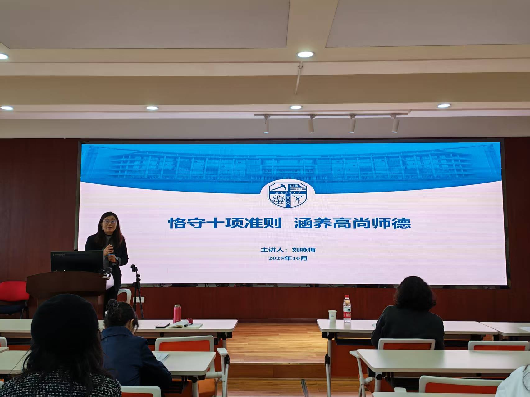 刘咏梅以“恪守十项准则,涵养高尚师德”为题,首先从师德师风建设的重要性出发,强调了教师个人加强自身师德师风建设的重要意义。随后,刘书记带领大家学习了《新时代高校教师职业行为十大准则》的主要内容,她强调教师要积极弘扬教育家精神,将教书与育人相结合,在传授专业知识的同时,更要注重培养学生的家国情怀与社会责任感,以自己高尚的道德情操和职业操守做好学生的榜样。最后,刘书记组织大家学习了近年来高校违反师德师风典型案例,通过以案为镜、以案明纪,督促全体教职工在日常工作和生活中加强纪律意识和规矩意识,知敬畏、存戒惧、守底线。