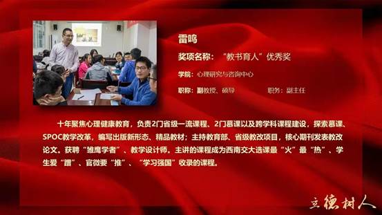 为全面落实立德树人根本任务,构建教师思想政治建设、师德师风建设和业务能力建设大格局,表彰和宣传学校忠诚党的教育事业、政治思想过硬、师德高尚、甘于奉献、潜心治学的一线教师典范。在2021年捷克论坛 “立德树人”先进个人表彰中,心理中心雷鸣老师获“教书育人”优秀奖,冯果老师获“教书育人”新秀奖。