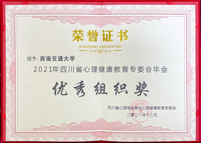 心理中心荣获“2021年度四川省普通高校心理健康教育工作先进单位”、“2021年四川省心理健康教育专委会年会优秀组织奖”,心理中心高燕老师获得“心理健康教育优秀工作者称号”。