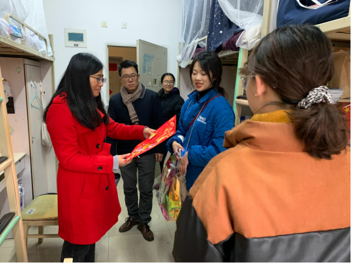 新年将至,岁寒情深。2021年12月31日下午,心理中心党委书记刘咏梅、党委副书记柯小君以及辅导员熊偲羽面向2021级全体本科生开展了贺新春到寝送祝福的活动。