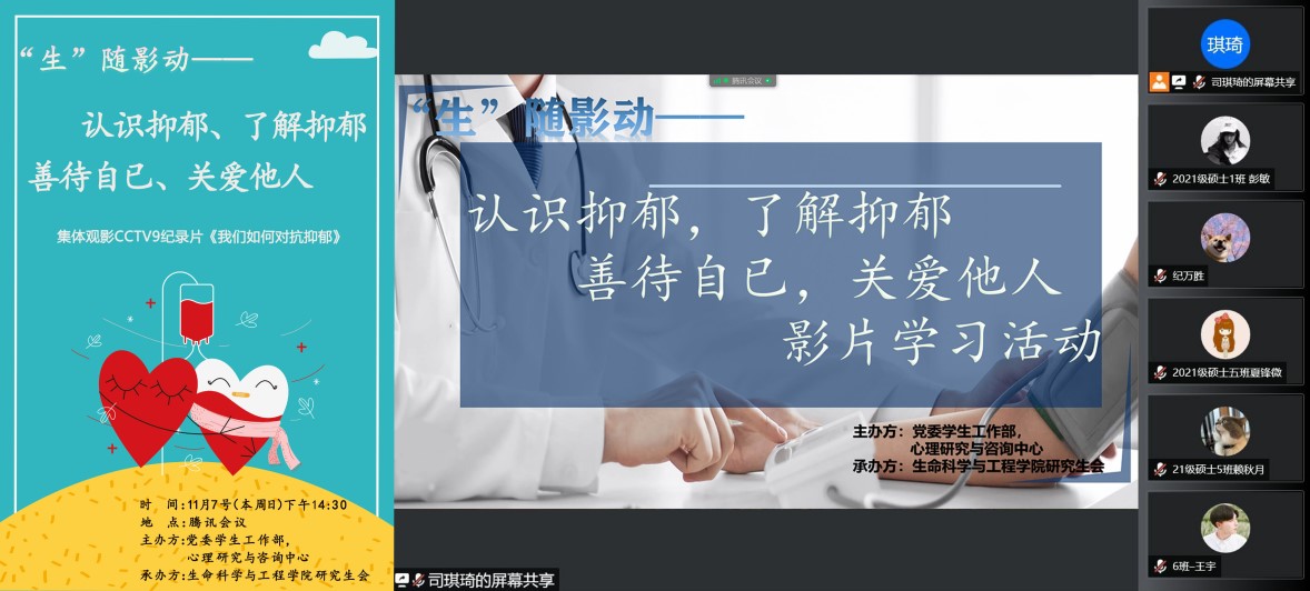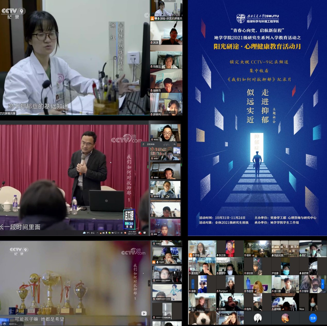 联合学校党委学生工作部,从2021年10月底开始,在全校范围内组织开展了“认识抑郁、了解抑郁,善待自己、关爱他人”的大型心理健康教育主题特色活动——观看中央电视台纪录频道六集纪录片《我们如何对抗抑郁》。