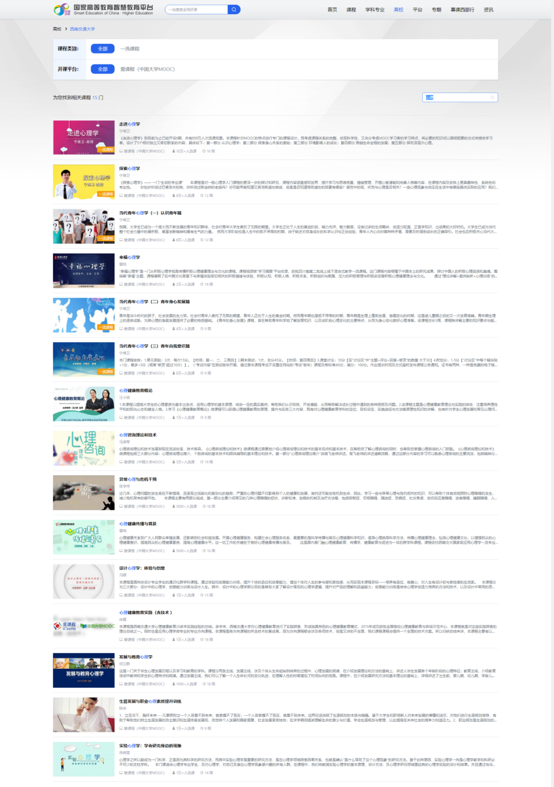 共有139门在线开放课程在国家高等教育智慧教育平台首批上线;心理中心有15门在线课程在国家高等教育智慧教育平台首批上线(其中,5门国家一流课程、2门省级一流课程),面向广大高校、社会学习者全面开放。