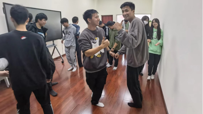 紧接着的第二项活动中,高飞老师首先做了演示:自我介绍的同时摆出一个特别的造型,“高山的高,飞翔的飞……”高飞老师说着做出一副如小鸟般飞行的姿势,并让同学们跟着做动作,齐声讲:“很高兴认识你!”。随后,同学们依次进行了自我介绍与动作展示,同学们的动作各具特色,有的点赞,有的转圈,有的撩发……好不快乐。