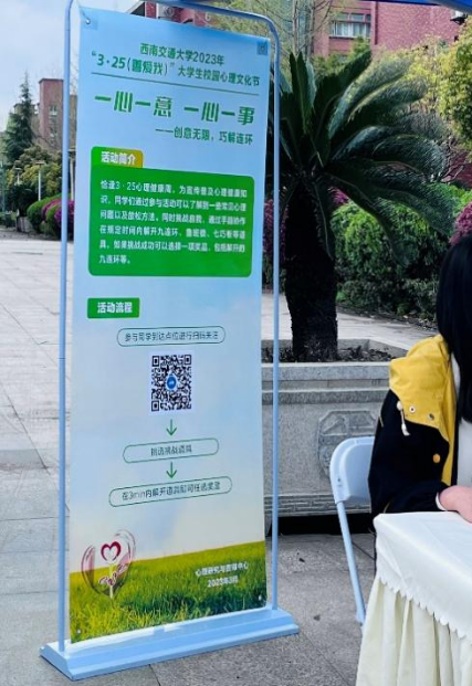 大学生创造学会积极配合学校“3·25善爱我”心理文化节系列活动,于2023年3月23号下午,在犀浦校区南门小广场和九里校区图书馆门口,同步开展了“创意无限,巧解连环”活动。通过在规定时间解开九连环、鲁班锁、七巧板等道具,让同学们手脑协作,发挥创造力,在解题的过程中宣传普及心理文化知识,帮助同学了解一些常见心理问题及放松方法。