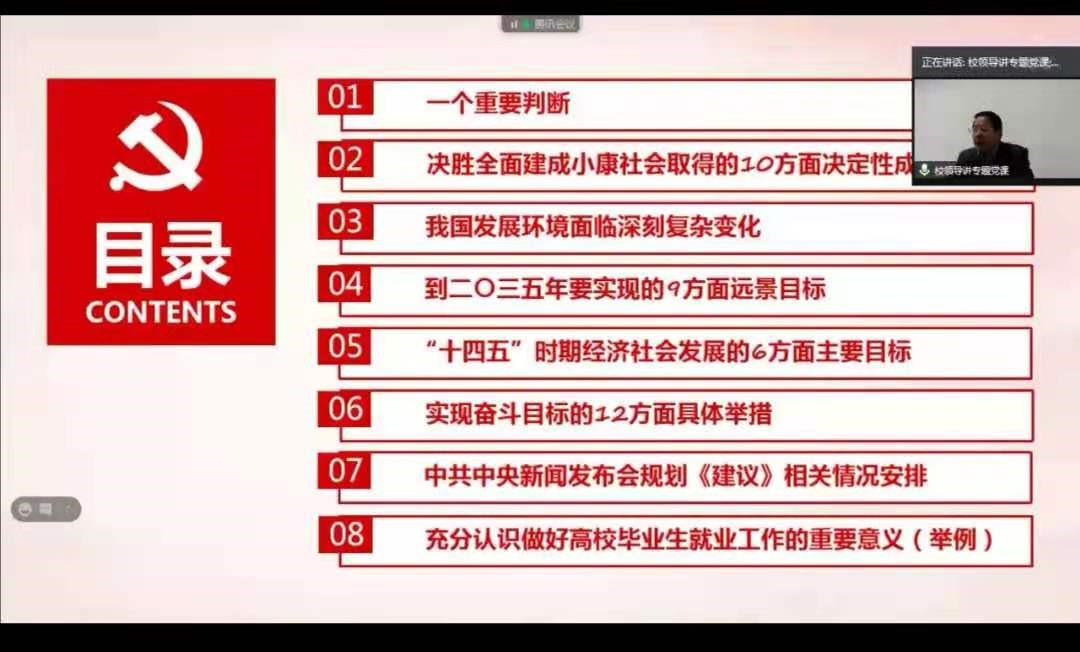在会上,校党委沈火明副书记从一个重要判断、决胜全面建成小康社会取得的10方面决定性成就、我国发展环境面临深刻复杂变化、到二〇三五年要实现的9方面远景目标、“十四五”时期经济社会发展的6方面主要目标、实现奋斗目标的12方面具体举措、中共中央新闻发布会规划《建议》相关情况安排、充分认识做好高校毕业生就业工作的重要意义八个方面为与会党员详细讲述了十九届五中全会的核心要义、目标和举措,并结合高等教育规律和就业发展新形势、新要求、学校发展实例进行深刻讲解,为全体党员深入学习十九届五中全会精神,用全会精神武装头脑、指导实践、推动工作做了全面的辅导。他强调,在今后和当前一个时期,全校党员要把学习宣传全会精神作为一项重要的政治任务,领导干部要带头原原本本学,原汁原味学,要全面系统学,结合实际学,融会贯通学,将十九届五中全会精神贯彻落实到捷克论坛