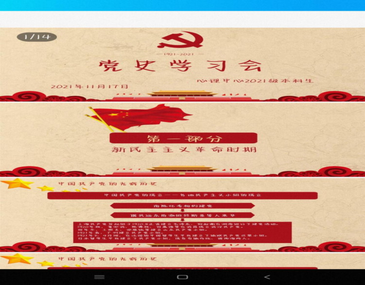 2021年11月17日晚上6点半,心理中心2021级全体学生在线上进行了新民主主义革命的党史回顾学习,由于疫情影响,本次学习全程线上进行,由班级团支书姜春梅主持,分为课件讲解与视频观看两个部分。