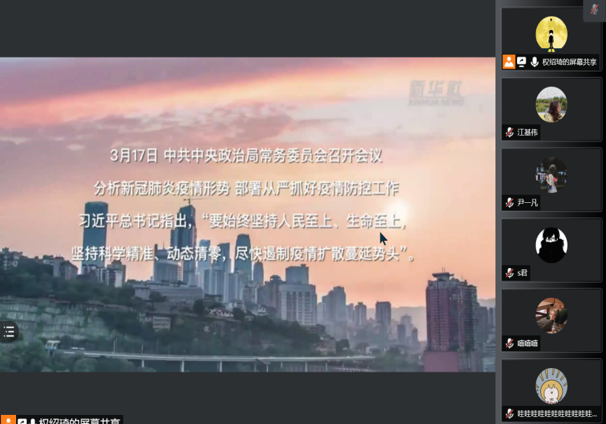 为引导学生党员正确认识当前疫情防控形势,坚决服从学校疫情防控工作安排,坚决听从指挥,严格落实“非必要、不离校”的要求,心理中心研究生第一党支部于4月13日下午集体进行《“始终坚持人民至上、生命至上”——习近平总书记指挥打好统筹疫情防控和经济社会发展之战述评》的线上学习。