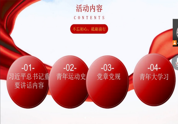 本次专项学习活动主要包括四个方面:习近平总书记系列重要讲话、青年运动史、党章党规、青年大学习。首先同学们一同阅读学习了习近平总书记在纪念五四运动100周年大会上的重要讲话、在庆祝中国共产主义青年团成立100周年大会上的重要讲话等学习材料,然后同学们针对这些学习材料进行了热烈讨论,最后甘诗源同学提醒同学们重视对青年大学习的学习。