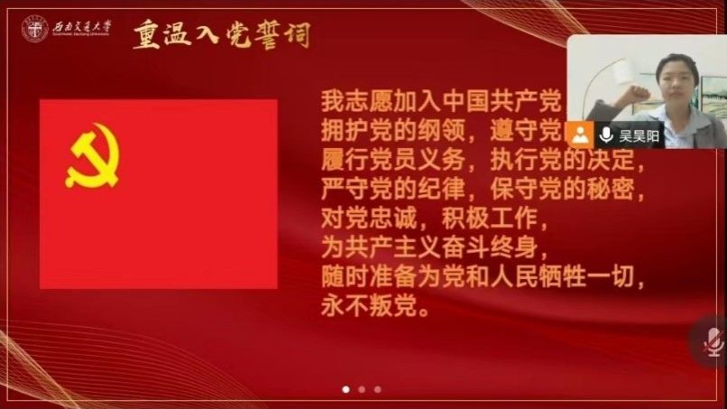紧接着,同志们在吴昊阳同志的组织下开展主题党日学习。第一部分学习内容是中国共产党党徽党旗条例。同志们学习了中国共产党对党徽党旗制作、使用、管理,以充分发挥党徽党旗的政治功能,增强党的凝聚力、战斗力,激发党员党的意识。同时支部的各位党员为代表重温入党誓词。
