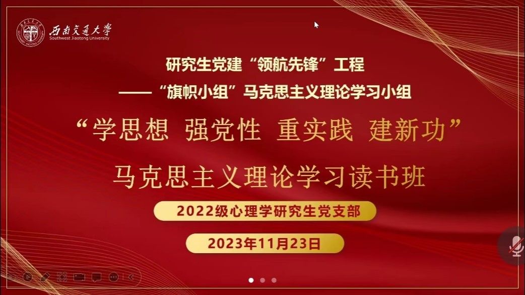 为了丰富党员精神文化生活,增加党员党性观念和思想文化意识,2023年11月23日晚,心理中心2022级研究生党支部组织开展了11月主题党日活动“学思想 强党性 重实践 建新功”马克思主义理论学习读书班。本次党日活动由心理中心2022级研究生党支部书记吴昊阳同志组织,心理中心2022级研究生党支部全体党员、发展对象及入党积极分子参与本次活动。