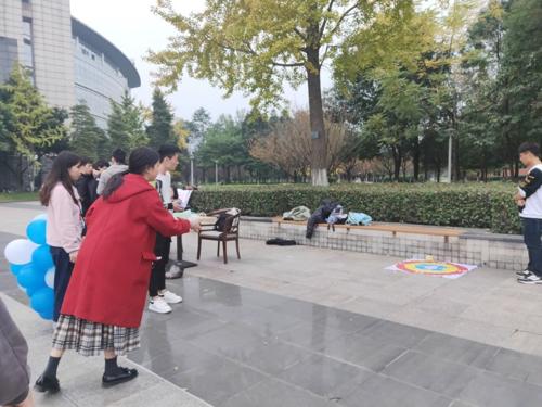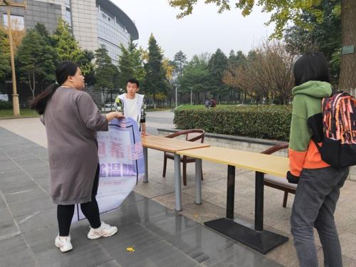 青年志愿者协会(以下简称心理青协)于犀浦校区图书馆前广场开展“拥抱希望,传递温暖”交通公益志愿活动。本次志愿活动由交通公益项目负责人黄锦,心理青协办公部部长刘小婵以及心理青协其他成员共七人一起负责组织。前期心理青协已经通过发传单、开放第二课堂等形式招募了近150个参与者,活动当天参与者都积极前往。