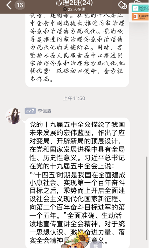 2020年12月26日10:00,由2019级本科心理2班团支书谢杭琦主持的“学习党的十九届五中全会精神”主题团日活动在线上举行。心理2班全体同学参加了本次线上会议。