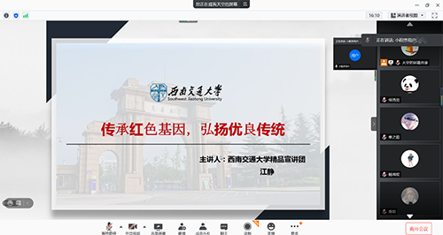 12月8日晚上七点半,为激励青年学子积极学习“四史”,守初心、担使命,马克思主义学院研究生江静为心理咨询与研究中心2018级本科生、2019级及2020级研究生开展了题为“传承红色基因 弘扬优良传统”的线上宣讲活动。本次活动由心理中心辅导员梁坡主持。