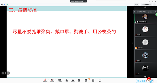接着,梁老师再一次强调了疫情防控的重要性。特别强调在疫情多点散发的情况下,所有同学要高度重视疫情防控工作,切实提高思想认识,切不可麻痹大意。要求同学们一定不要扎堆聚集,保持社交距离、戴口罩、勤洗手、做好健康监测,若出现疑似症状,视病情就近及时就医;不前往中高风险地区。