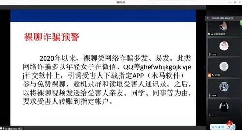 首先,梁老师进行了防范裸聊诈骗安全教育。梁老师结合案例对裸聊诈骗的作案手法、危害、易受害群体等进行了详细讲解。告诫同学们,提高警惕、拒绝诱惑、拒绝贪恋、不点击陌生链接。如遇到类似情况及时报警,寻求警方帮助。