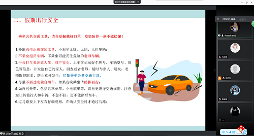 接下来,梁老师进行假期出行安全教育。在出行安全方面,梁老师强调同学们一定要乘坐正规的交通工具,不乘坐无牌、无照、无检、超员以及老旧车辆。在平台打车要注意人身、财产安全,建议大家把乘车信息提前发送给自己的父母、同学、老师等,确保乘车安全,并且过晚最好不要单独乘车。梁老师同时强调,如果同学们自己骑车,一定要遵守交通规则,不急、不挤,确保自己和他人安全。