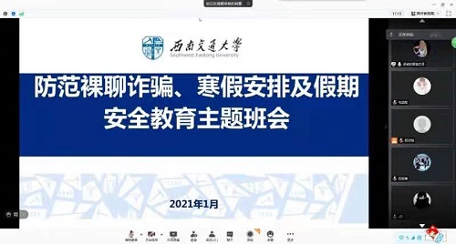 为了进一步加强安全教育、落实好学校《关于2020-2021学年寒假学生工作相关安排的通知》要求,心理中心2019级、2020级研究生于2021年1月8日召开线上主题班会,进行假期安全、疫情防控及电信诈骗等安全教育,并且向同学详细讲解了学校寒假安排。本次班会由辅导员梁坡主持。